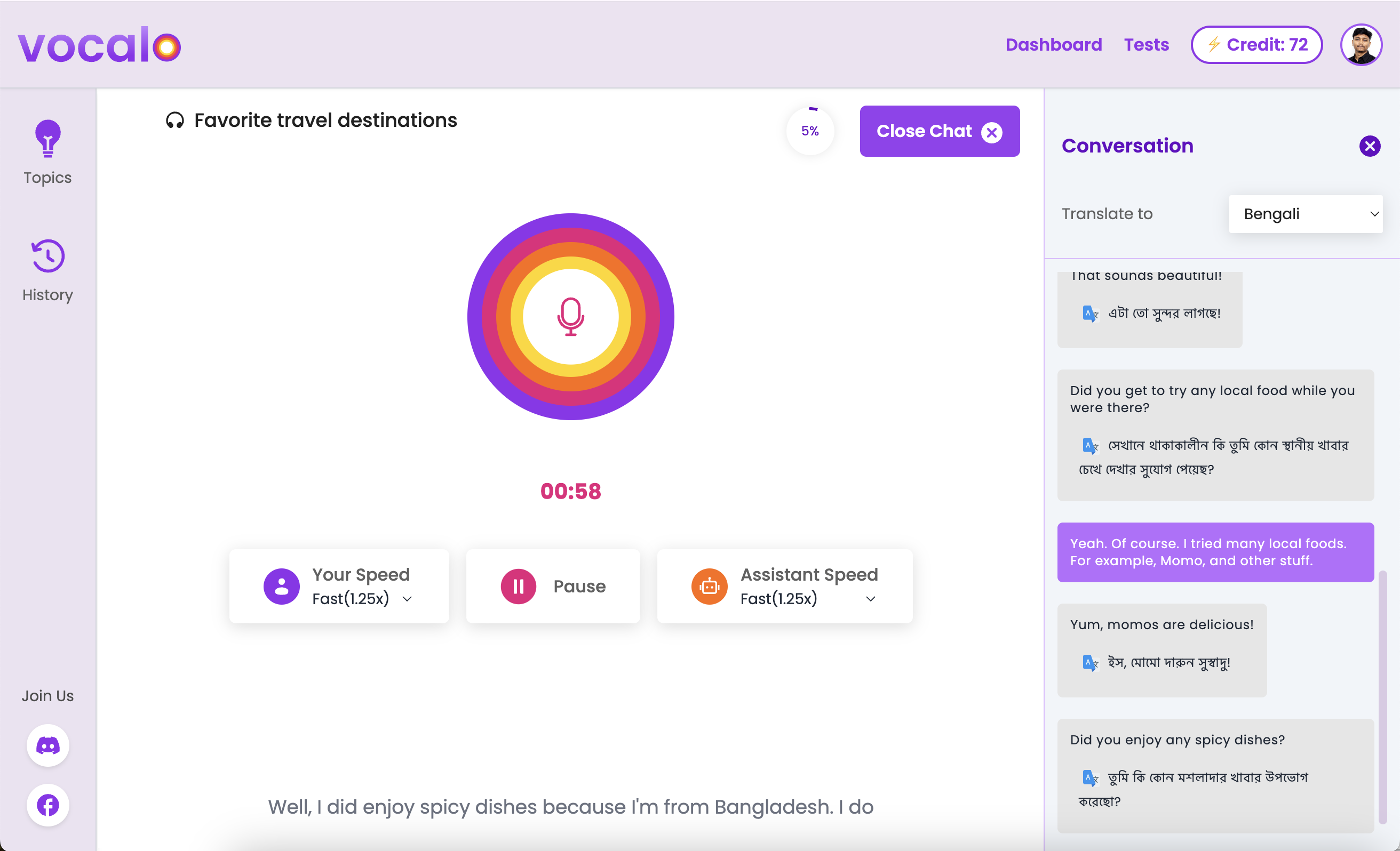 Vocalo provides live translation of your conversation in real-time. This helps you understand the conversation better and learn new words and phrases. You can also see the translation of your conversation after it ends.